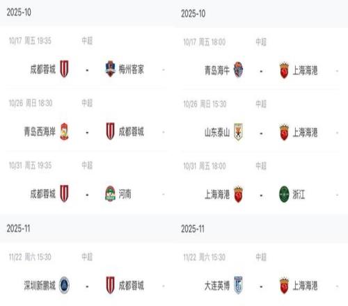 仅落后上海海港2分排在积分榜第2的成都蓉城,他们接下来将会先后对阵梅州客家、青岛西海岸、河南、深圳新鹏城,这四支球队当中梅州客家、深圳新鹏城都属于保级球队,青岛西海岸虽然近期上升势头明显,但是成都蓉城面对这三支球队都有全取三分的能力。