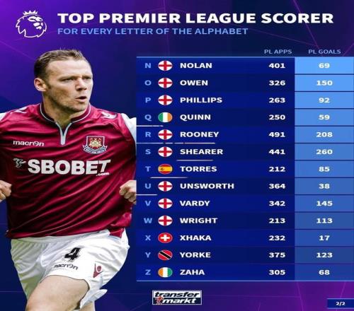 德转按姓氏首字母列英超历史最佳射手:亨利、凯恩、鲁尼在列