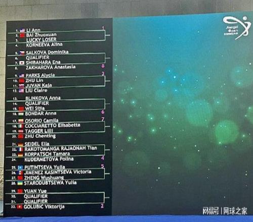 九江站:李吉妮、格鲁比奇、帕克斯、库德梅托娃位列前四号种子。中国有六将出战,其中白卓璇vs李吉妮、朱琳vs 帕克斯、韦思佳vs 邦达尔、朱宸汀vs 塔格尔、郑妩双vs 斯塔罗杜布采娃、袁悦vs资格赛球员。