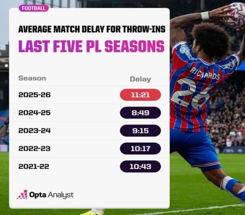 当地时间10月29日,知名数据机构Opta发布长文分析了2025-26赛季英超比赛的中断时长,各队在处理角球(36.3秒)、界外球(17.9秒)的平均时长均为历史最慢纪录。