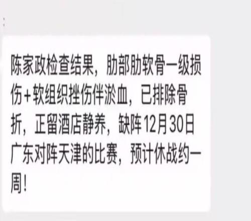 赛后有媒体透露陈家政的具体伤病情况,他出现了呕吐现象,经过检查,结果为肋部肋软骨一级损伤,软组织挫伤伴淤血。万幸的是没有骨折,正在酒店静养。
