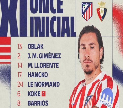 马竞vs奥萨苏纳:格子、小蜘蛛联袂首发,小西蒙尼替补